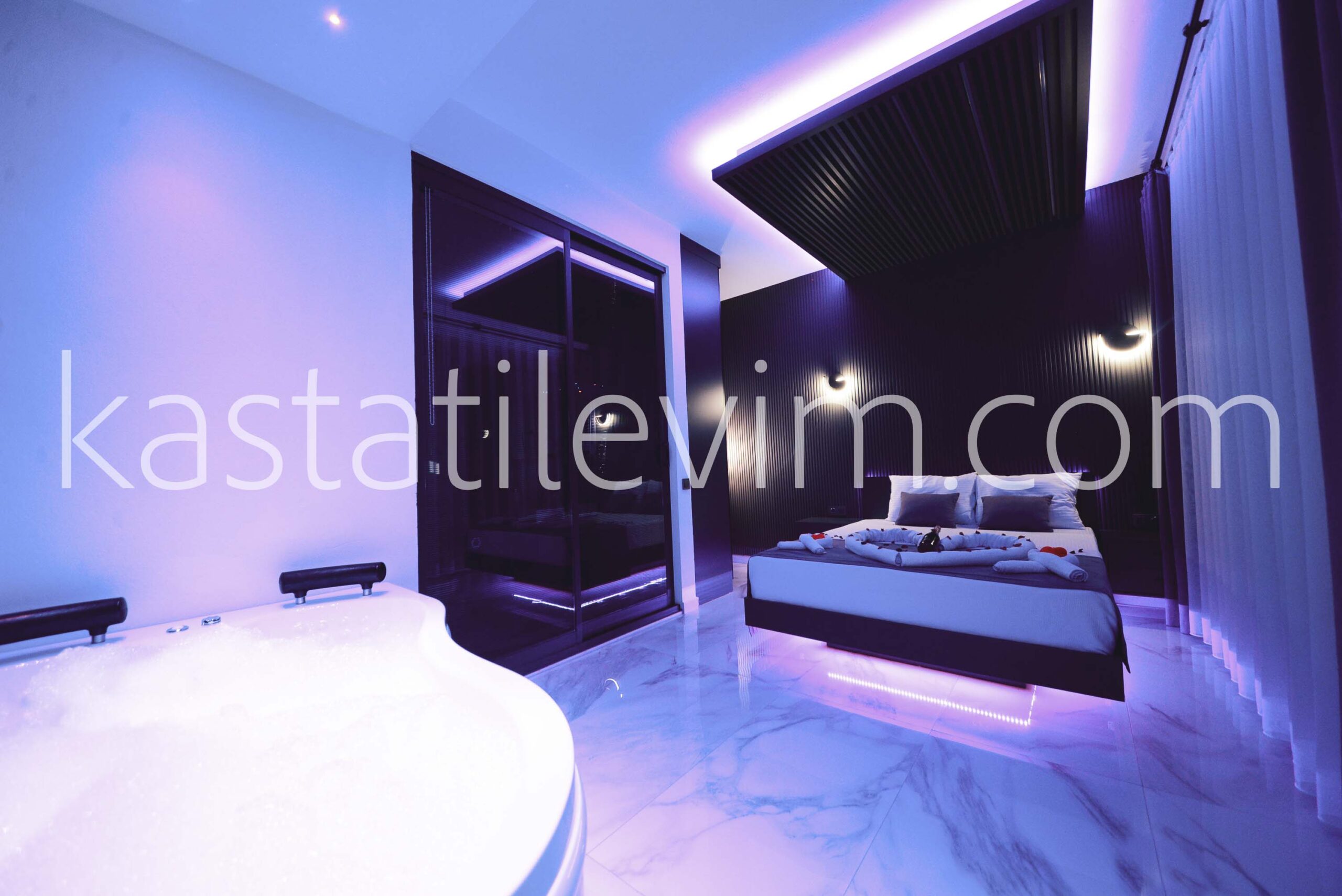 1. Yatak Odası: 1 Adet Çift Kişilik yatak, giysi dolabı, komidin, klima ve Jakuzi bulunur.