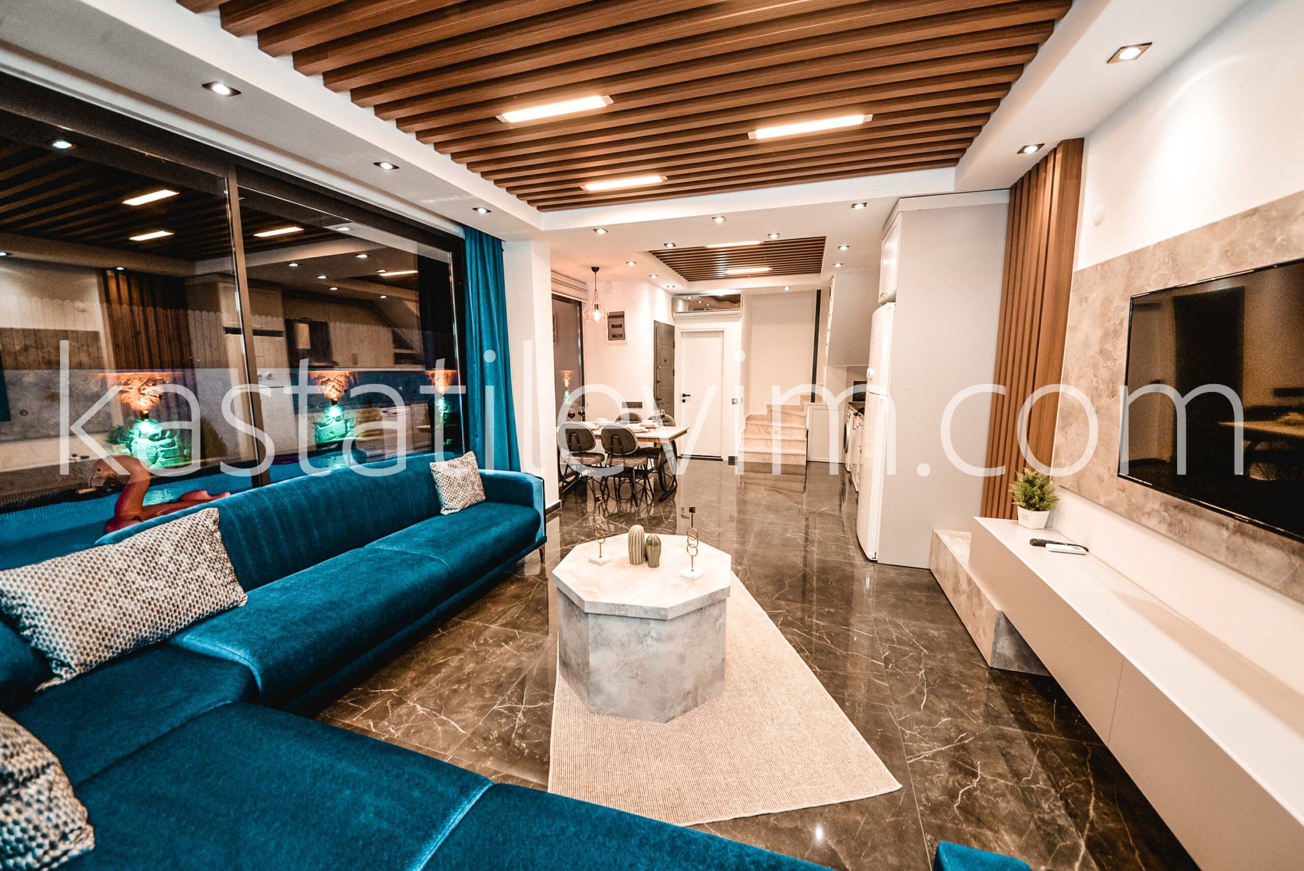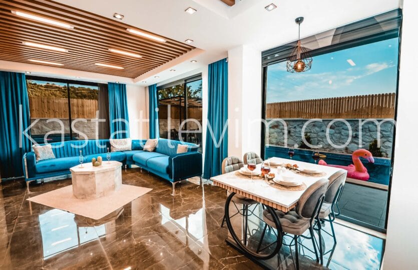 1. Katta: Açık Mutfağı olan 1 Salon, yemek masası, yatak odalarına çıkan merdivenli hole çıkış, bahçe terasına ve havuz kenarına yapılan bir çıkış bulunur.