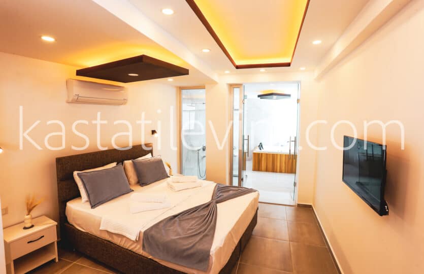1. Yatak Odası : 1 çift kişilik yatak, giysi dolabı, 2 komidin, klima, tv, jakuzi ve ebeveyn banyosu vardır.